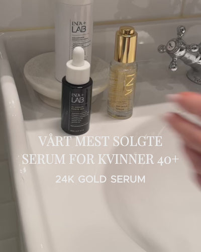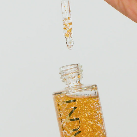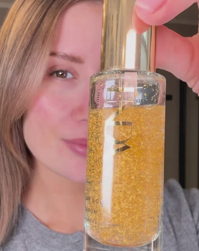 Vår bestselger 24K Gold Serum blander fuktighetsgivende hyaluronsyre, EGF-vekstfaktor og ekte 24 karat gull
